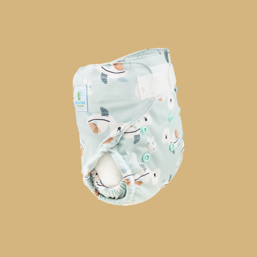 Die Blümchen-Überhosen für Neugeborene mit den doppelten Beinbündchen sind eher grosszügig geschnitten und passen ab ungefähr 3 kg bis 6 kg oder sogar noch länger. Sie sind in neuen wunderhübschen"Cozy Designs" erhältlich. Auch diese Überhosen lassen sich mit Snaps in der Höhe einstellen, so dass sie perfekt auf das Baby angepasst werden können. Die Laschen innen halten längs eingelegte Saugeinlagen gut an Ort und Stelle. Sie können für über gefaltete Mullwindeln, Prefolds oder auch Höschenwindeln verwendet werden. Die Neugeborenen-Überhosen gibt es nur als Klett-Variante.