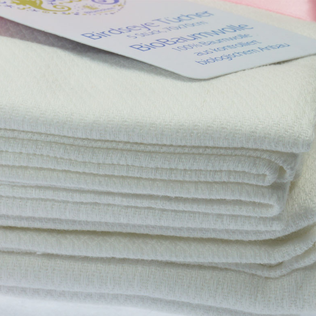 Diese Mullwindeln haben die spezielle "Bird Eye"-Webart. Sie trägt trotz des hohen Flächengewichts und der grossen Saugstärke nicht auf.