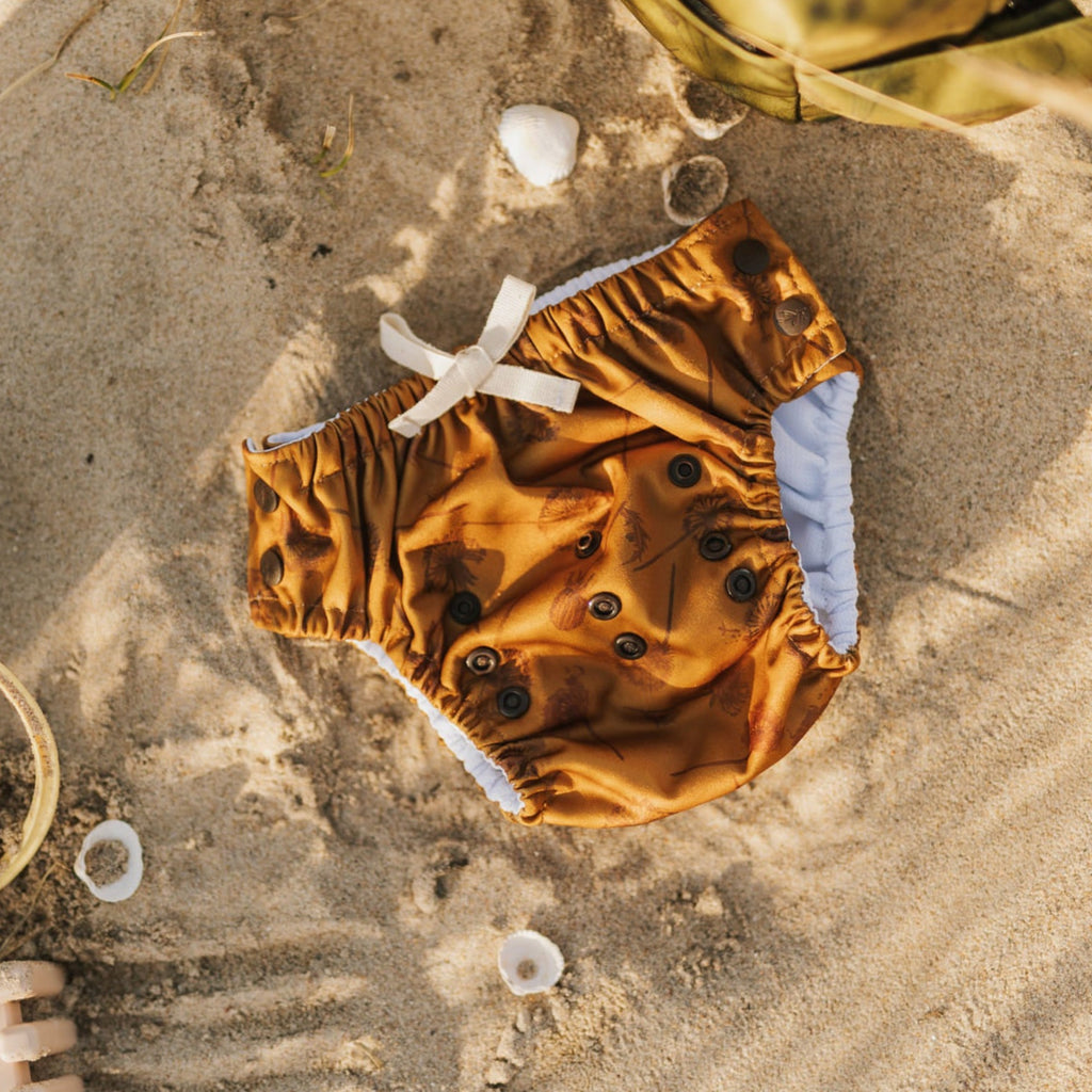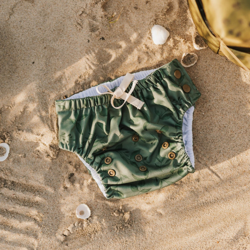 Die Druckknöpfe an den Seiten erleichtern das An- und Ausziehen der Schwimmwindel wie bei einer normalen Windel. Dies ist vorteilhaft, wenn Stuhlgang drin ist. Das Baumwollband lässt sich enger oder lockerer ziehen und bietet so noch mehr Verstellmöglichkeiten.