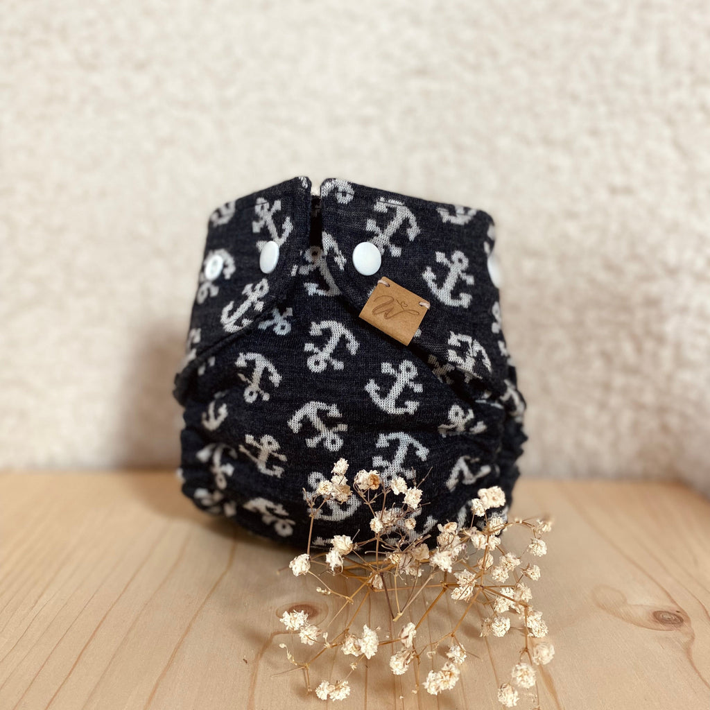 Der weiche und dichte Innenstoff aus Bio-Merinowolle wird in Deutschland gestrickt. Die Wolle stammt aus biologischer und mulesingfreier Tierhaltung. Der Aussenstoff dieser Windel ist ebenfalls in Bio-Qualität und stammt aus mulesingfreier Tierhaltung.