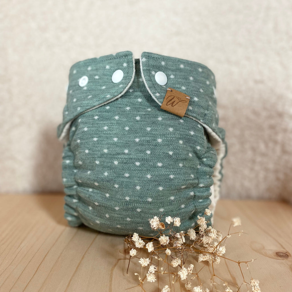 Der weiche und dichte Innenstoff aus Bio-Merinowolle wird in Deutschland gestrickt. Die Wolle stammt aus biologischer und mulesingfreier Tierhaltung. Der Aussenstoff dieser Windel ist ebenfalls in Bio-Qualität und stammt aus mulesingfreier Tierhaltung.