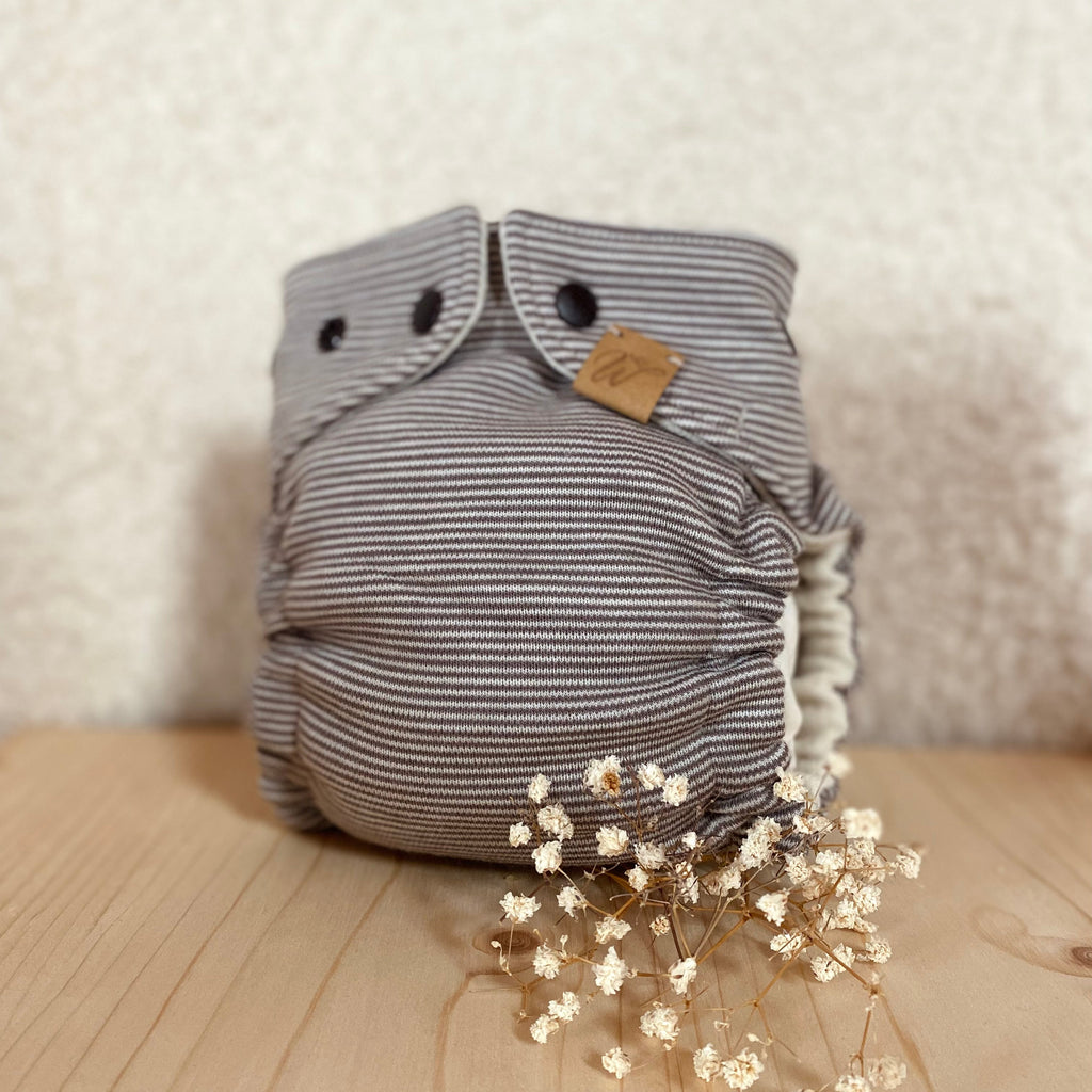 Der weiche und dichte Innenstoff aus Bio-Merinowolle wird in Deutschland gestrickt. Die Wolle stammt aus biologischer und mulesingfreier Tierhaltung. Der Aussenstoff dieser Windel ist ebenfalls in Bio-Qualität und stammt aus mulesingfreier Tierhaltung.
